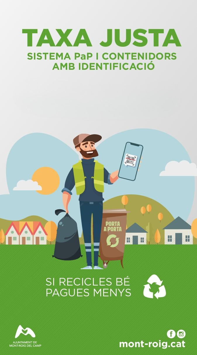 L’Ajuntament de Mont-roig del Camp té en vigor la Taxa Justa, un sistema de pagament del servei de recollida de residus que té com a objectiu premiar les llars que reciclen més i millor. El projecte s’ha implantat tant a les zones amb recollida Porta a Porta (urbanitzacions Club Mont-roig, Costa Zèfir i Bonmont) com al nucli urbà de Mont-roig del Camp i a una part del barri de la Florida de Miami Platja (envasos i orgànica) en concret entre les avingudes Diversitat, Barcelona, Almeria, del Mar i Saragossa. A l’Avinguda Diversitat, Avinguda del Mar i Saragossa només estaran afectats els números imparells i a l’Avinguda Barcelona només els números parells. Amb aquest sistema, cada veí i veïna podrà demostrar el seu compromís amb el reciclatge i reduir l’import a pagar pel servei de residus.